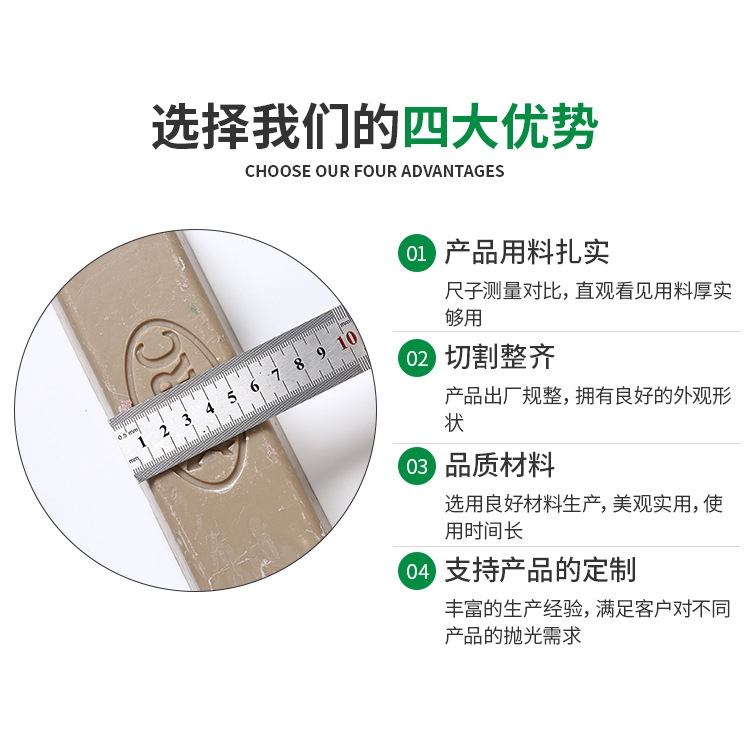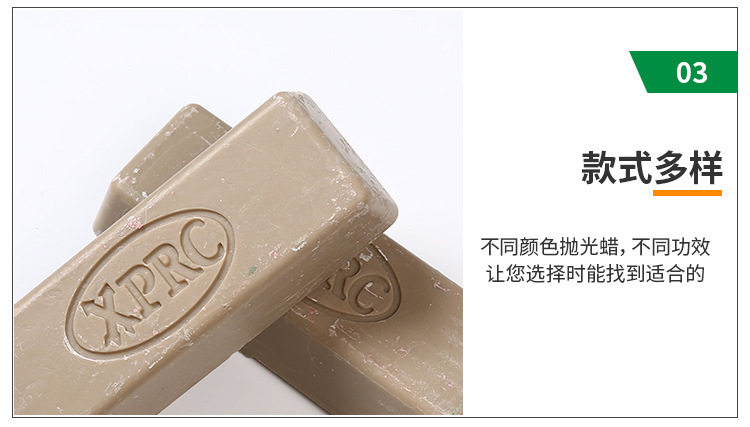 型號:5號黃臘。一般情況下用不同的顏色表示不同品種的拋光臘,避免使用時混亂。高含量的磨料可以加速整個拋光過程。這個過程是拋光臘拋光輪表面移動而使材料變得光滑。